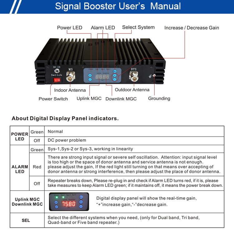 用户可以通过 LED 数字面板选择增益和工作系统。